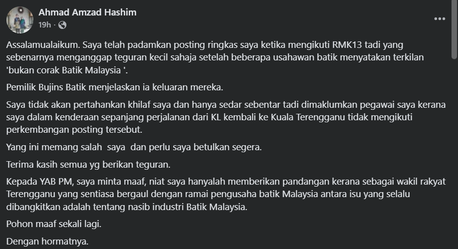 “Yang ini memang salah saya dan harus saya luruskan segera. Terima kasih kepada semua yang telah memberikan teguran. Kepada YAB Perdana Menteri, saya minta maaf. Niat saya hanyalah memberikan pandangan sebagai wakil rakyat Terengganu, karena saya sering berdiskusi dengan para pengusaha batik lokal mengenai masa depan industri batik Malaysia,” lanjutnya.